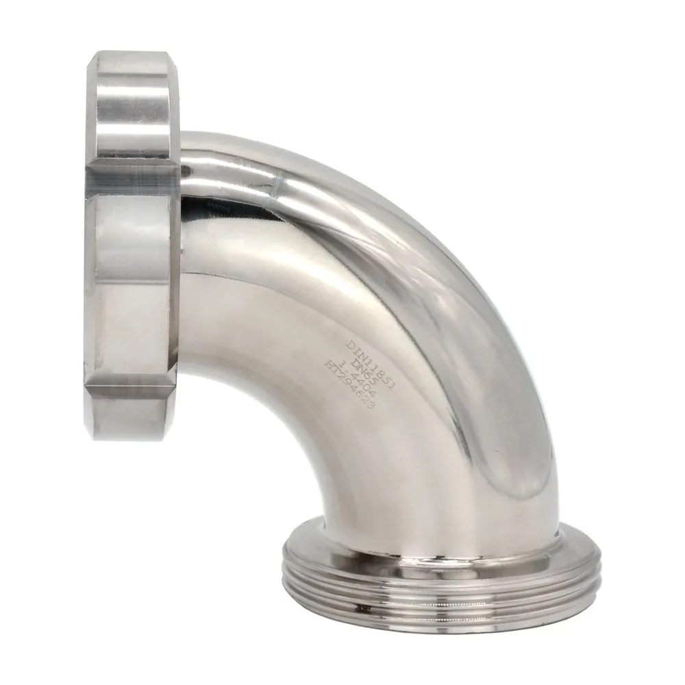 Milchrohrverschraubung nach DIN 11851 – Bogen 90° Kegelstutzen mit Überwurfmutter und Außengewinde.